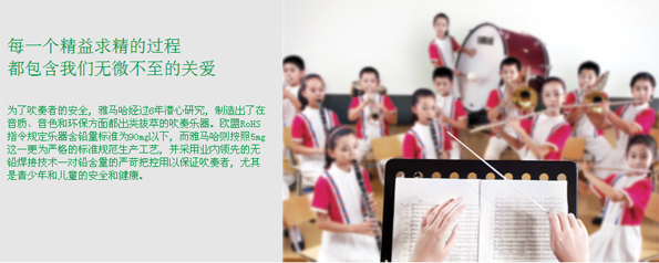 雅馬哈為了下一代可以吹出健康,吹出未來,經(jīng)過6年潛心研究,終于在使用無鉛焊接技術(shù)的基礎(chǔ)上,制造出了不僅是在音質(zhì)、音色而且環(huán)保方面都出類拔萃的吹奏樂器。